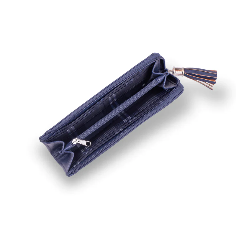 Molto pratico e con la classica apertura a ventaglio e una zip portamonete centrale. L'interno del portafoglio è in stile scozzese.